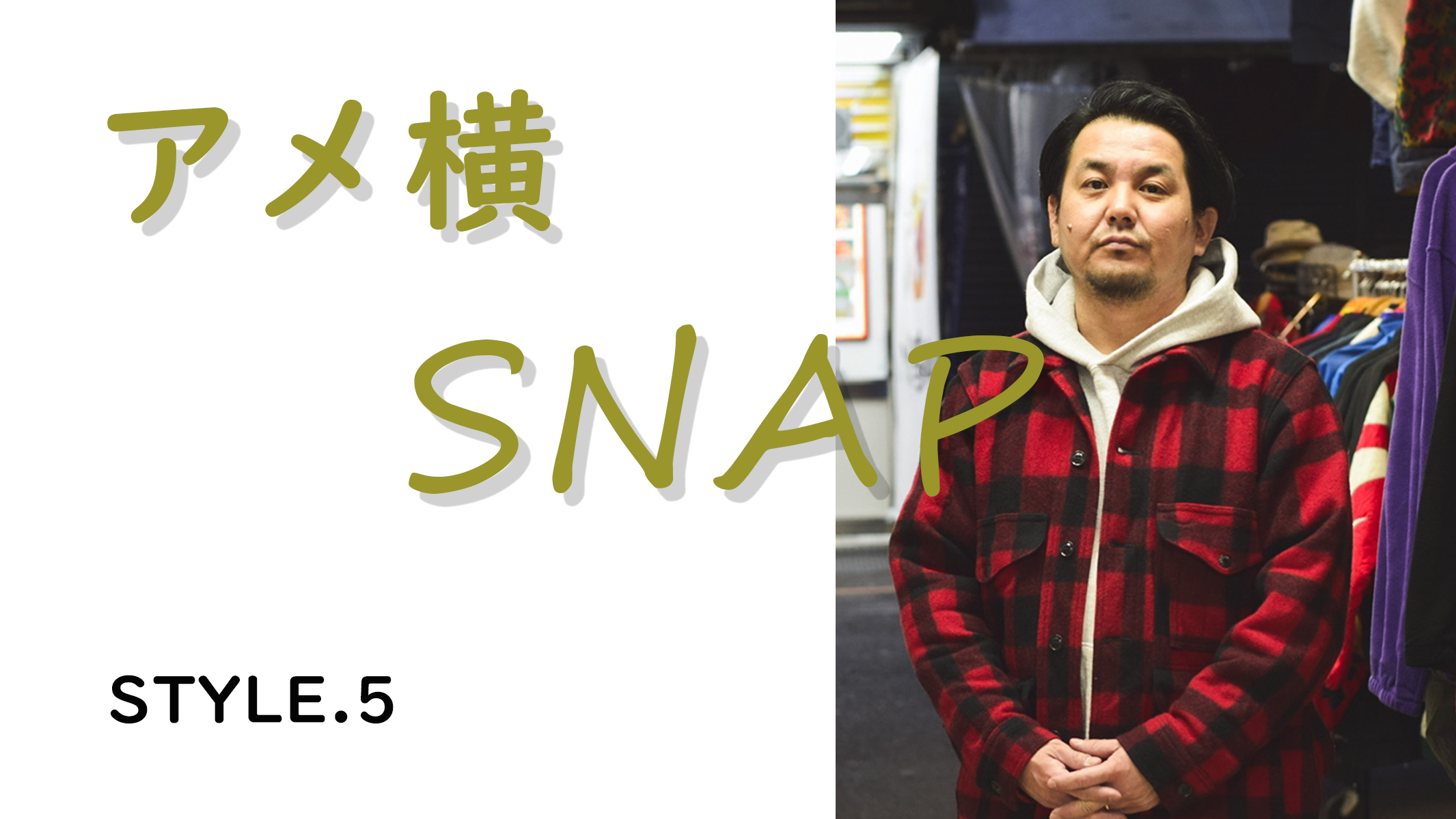 Style.5 名前: 土屋さん (Men's) 年齢: 41歳 身長: 165cm 職業: Jalanaスタッフ おすすめのアメ横のお店・スポット JALANA、ヤリキ、タイ料理 メーアン Jacket: Filson <Jalana> Sweat: Losangels Apparel <Jalana> 【インポートセレクトショップ】Jalana御徒町駅前通り店 SHOP 【赤提灯系】クシヤキ酒場ヤリキ上野総本店 GOURMET