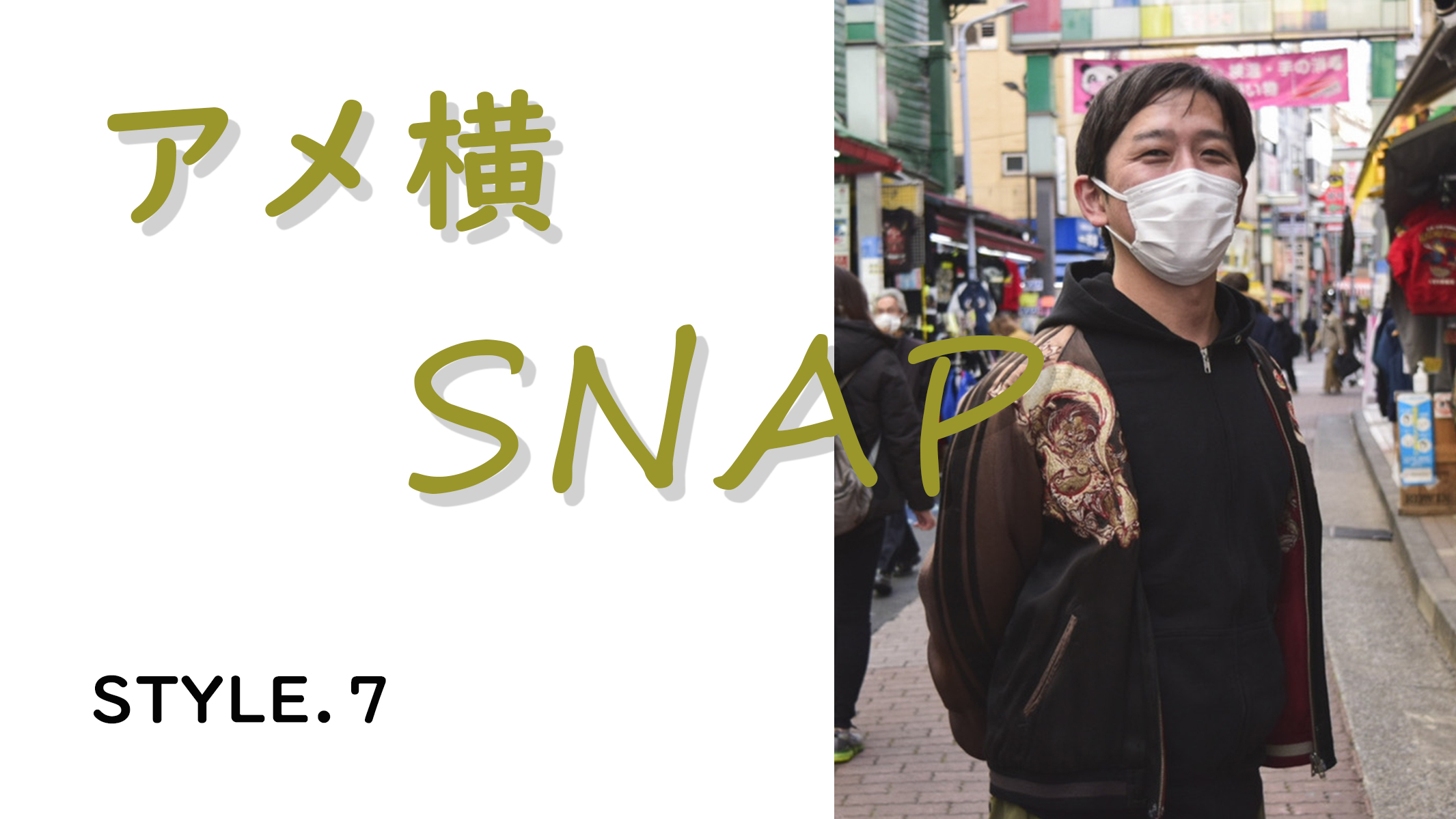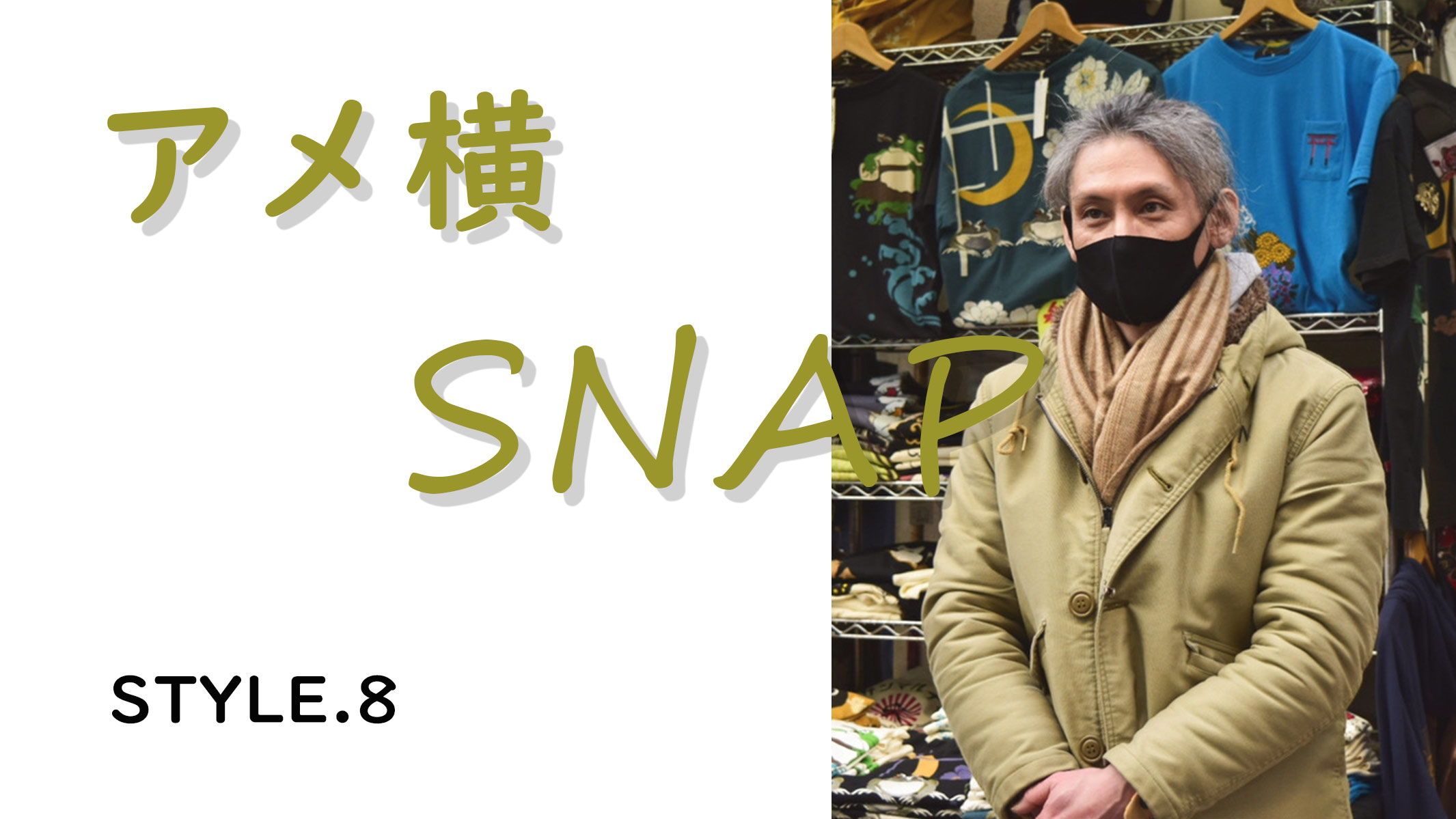 Style.8 名前: 一ノ瀬さん (Men's) 年齢: 47歳 身長: 170cm 職業: FIT'S スタッフ おすすめのアメ横のお店・スポット 立ち飲みタキオカ、魚草 【和柄専門店】FIT’S&FRESH SHOP