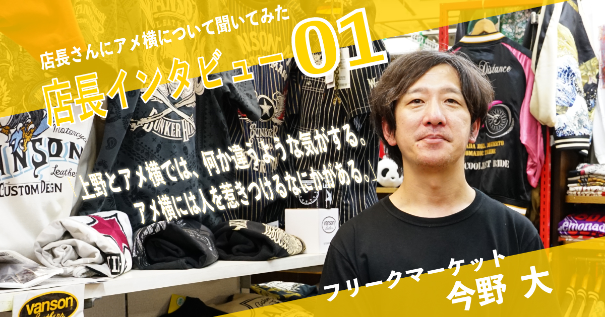 普段からアメ横を注意深く見ている店長さんにアメ横について聞く「店長インタビュー in AMEYOKO」。第1弾は、アメ横で2店舗展開する和柄専門店「フリークマーケット」の店長今野さん! 今野 大(FIT'S取締役) 高校生のころから上野に買い物に来ていた。大学卒業後、アルバイトとしてFIT’Sに入社。その後、店長になる。アメ横歴約30年。趣味は、銭湯巡り。 「上野とアメ横では、何か違うような気がする。アメ横には人を惹きつけるなにかがある。」 コロナの影響を受けたアメ横 コロナ下でインバウンドのお客さんが渡航できないこともあり、お客さんが目に見えて減った。このままだと忘れ去られてしまうのではないかと心配するくらいに。コロナ真っ只中に比べたらインバウンドのお客さんも少しずつ増えてきて、以前の賑わいを取り戻しつつあるが、年齢層の高いお客さんの中にはコロナを警戒してまだ戻って来ていない方も多いと感じている。 「アメ横にないものはない。」 「アメ横にないものはない。」物量、商品の種類が多いのがアメ横の魅力。最